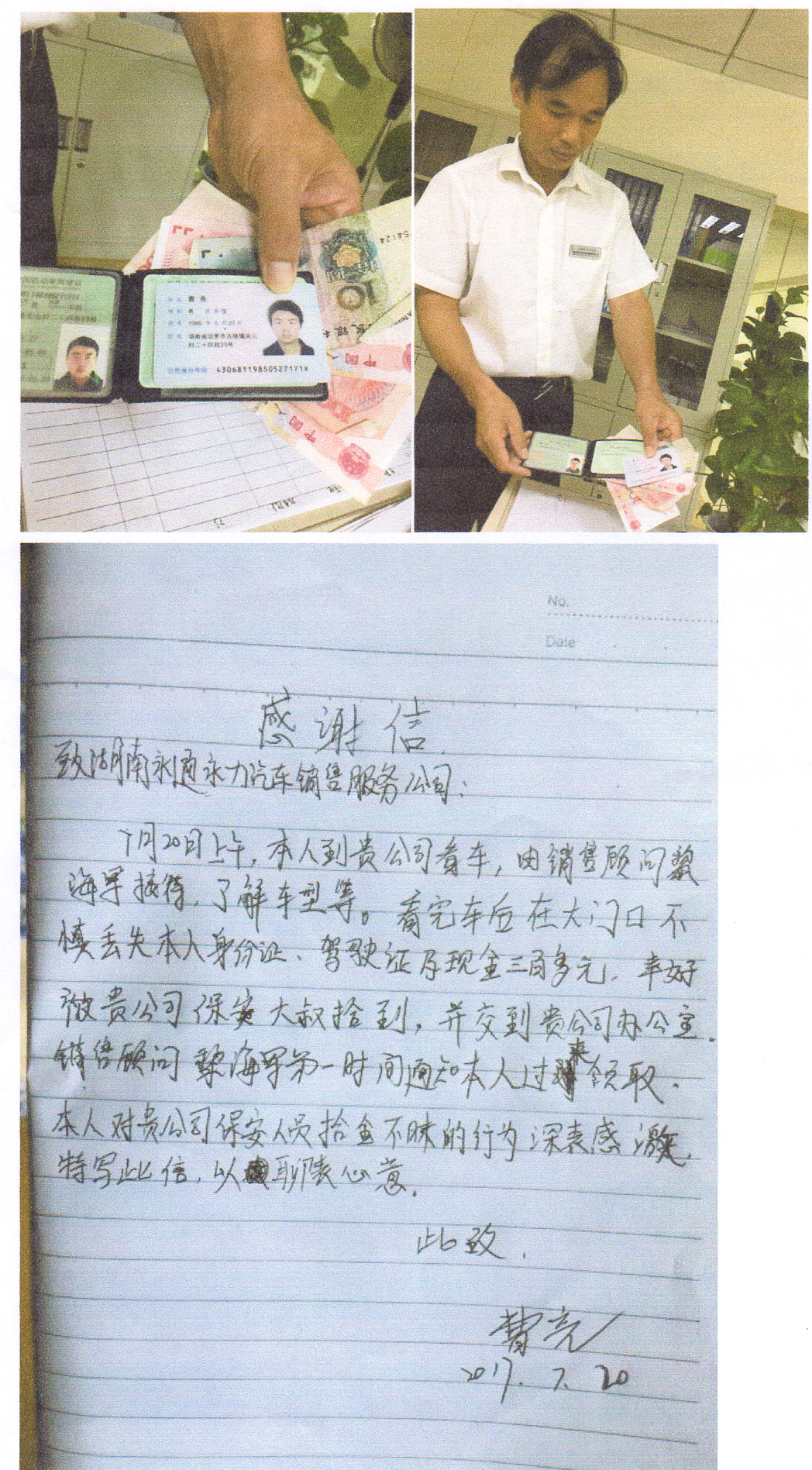 7月20日,望城项目实习主管肖林生在永通福特汽车4S店执勤中发现道闸处地面有一个钱包,钱包里有失主身份证、银行卡等重要证件和部分现金。他立即联系客户经理,并将钱包上交到福特汽车4S店行政部。在福特汽车4S店的联系下,找到了失主。失主为表示感谢,特地给肖林生同志写来了感谢信件。同时,业主福特汽车4S店也对肖林生这种拾金不昧的精神以及平时认真负责积极主动的工作情况,特致信提出高度表扬。