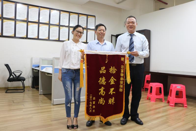 8月25日,普瑞物业公司泊富国际广场项目安全管理部同事王本全在巡检车库过程中,捡到一台全新电脑。随后该员工立即将电脑送至安全管理部办公室,并告知部门主管。公司各部门立即去到各单元寻找失主,经仔细核对后最终在写字楼14楼找到失主,失主来到物业公司将电脑领走,并对该员工拾金不昧的精神表示感谢。